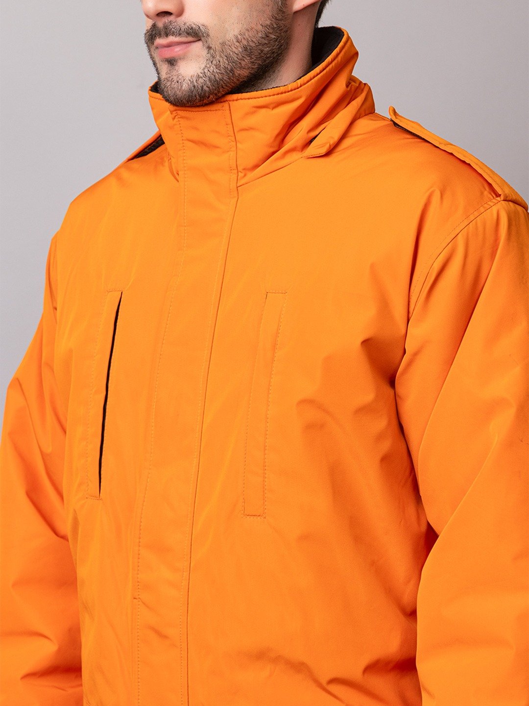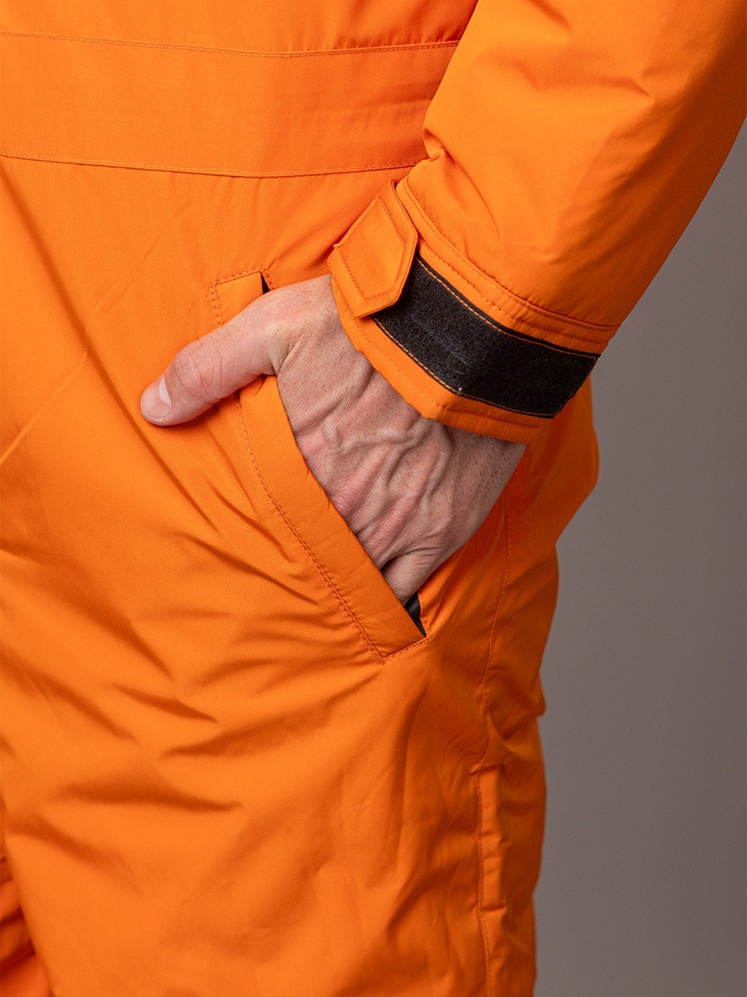 Practical design meets outdoor utility with two vertical zippered chest pockets for secure storage of essentials. The adjustable hook-and-loop cuffs and elasticated ankle cuffs ensure a snug, customized fit, preventing heat loss while maintaining comfort during movement. Finished in a bright solid color, it not only improves visibility on rugged trails but also delivers a sleek, modern look for everyday wear.