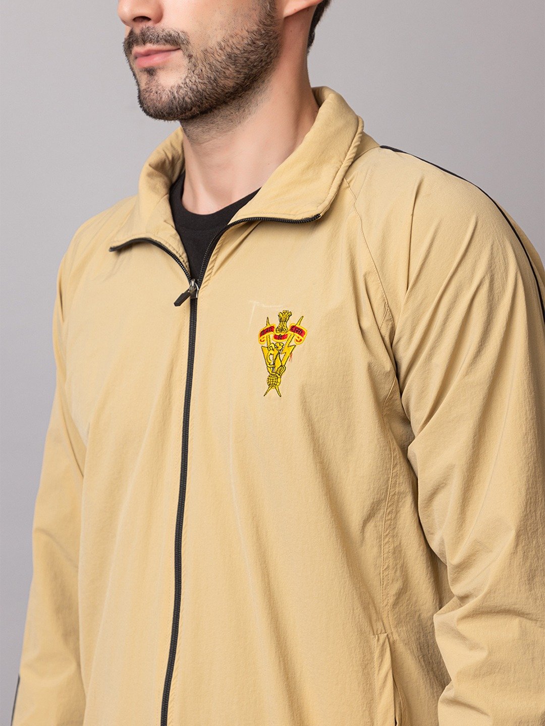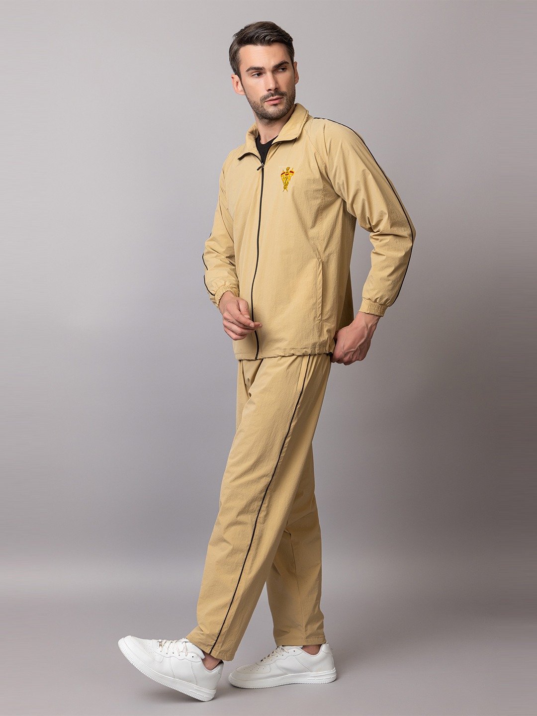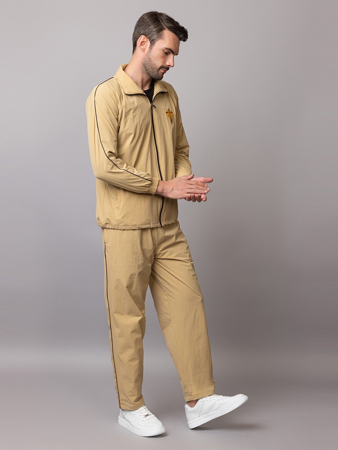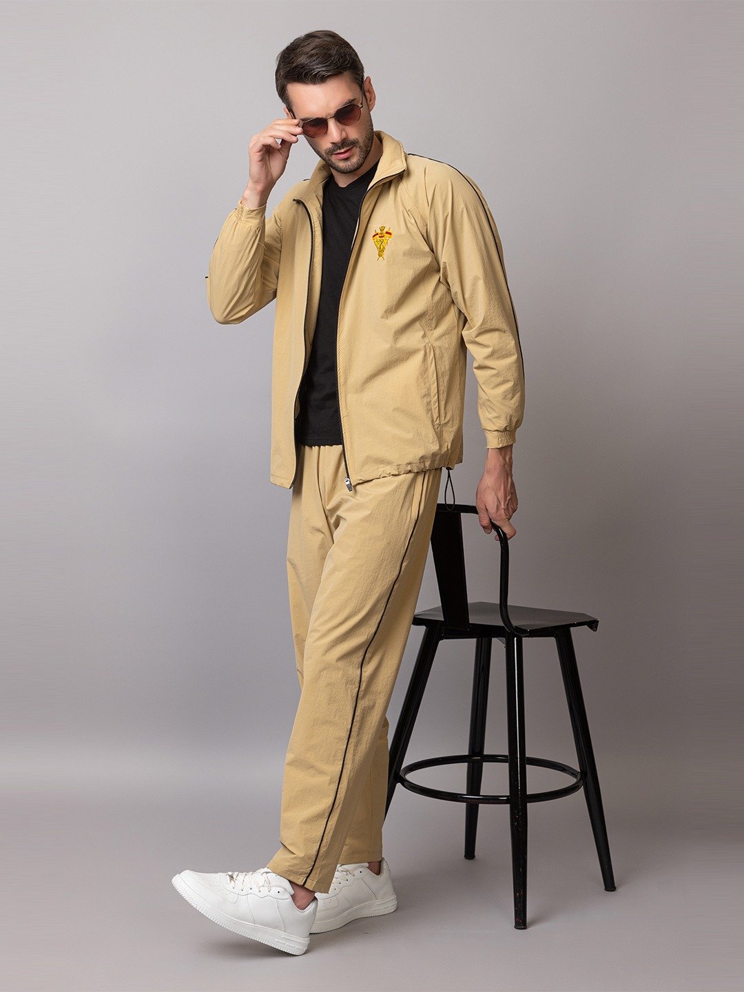 The jacket features embroidered chest branding, offering a timeless and premium touch. It pairs perfectly with the coordinated track pants, designed with an elasticated waist and convenient ankle zips that make dressing effortless.